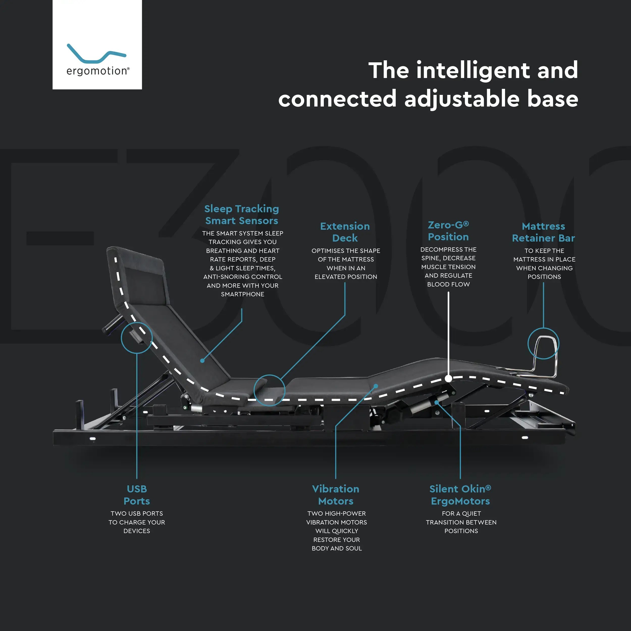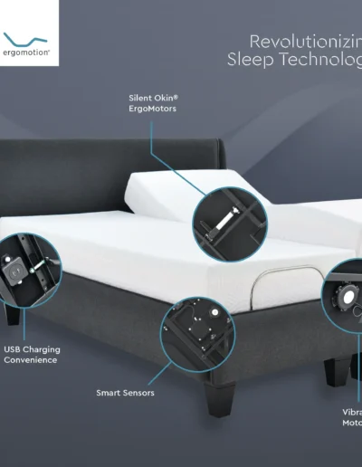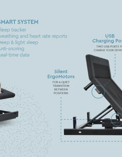 The ErgoSmart by Ergomotion® is not just a bed foundation; it is a complete, technologically advanced sleep system designed to deeply understand and improve your rest. By combining non-contact biometric tracking with automatic ergonomic adjustments, the ErgoSmart adapts to your body’s needs in real-time.