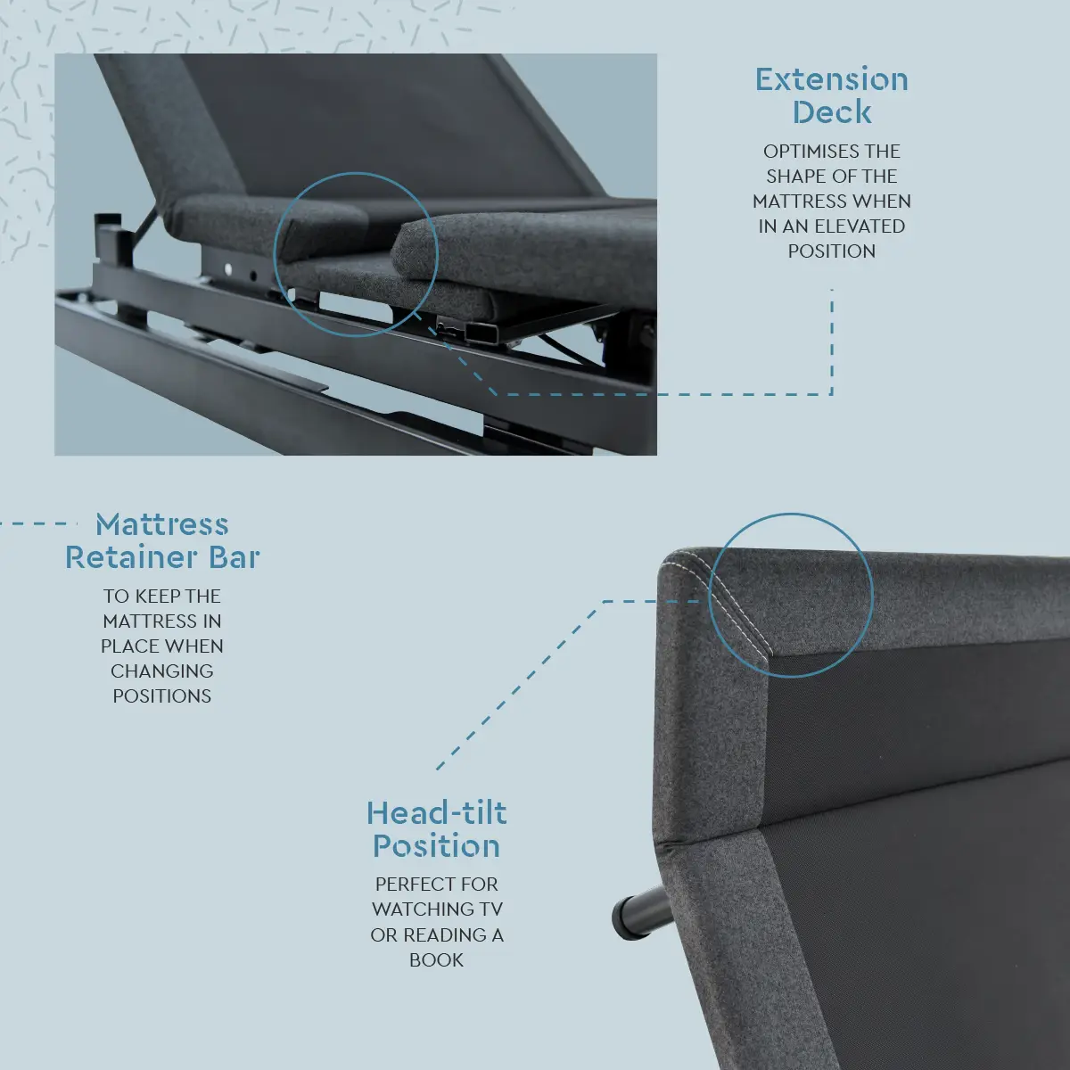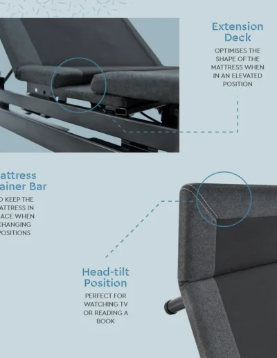 Advanced Ergonomics: Features Independent Head and Foot Articulation, an Auto Head-tilt for perfect neck support, and dedicated Lumbar Support to relieve lower back tension.